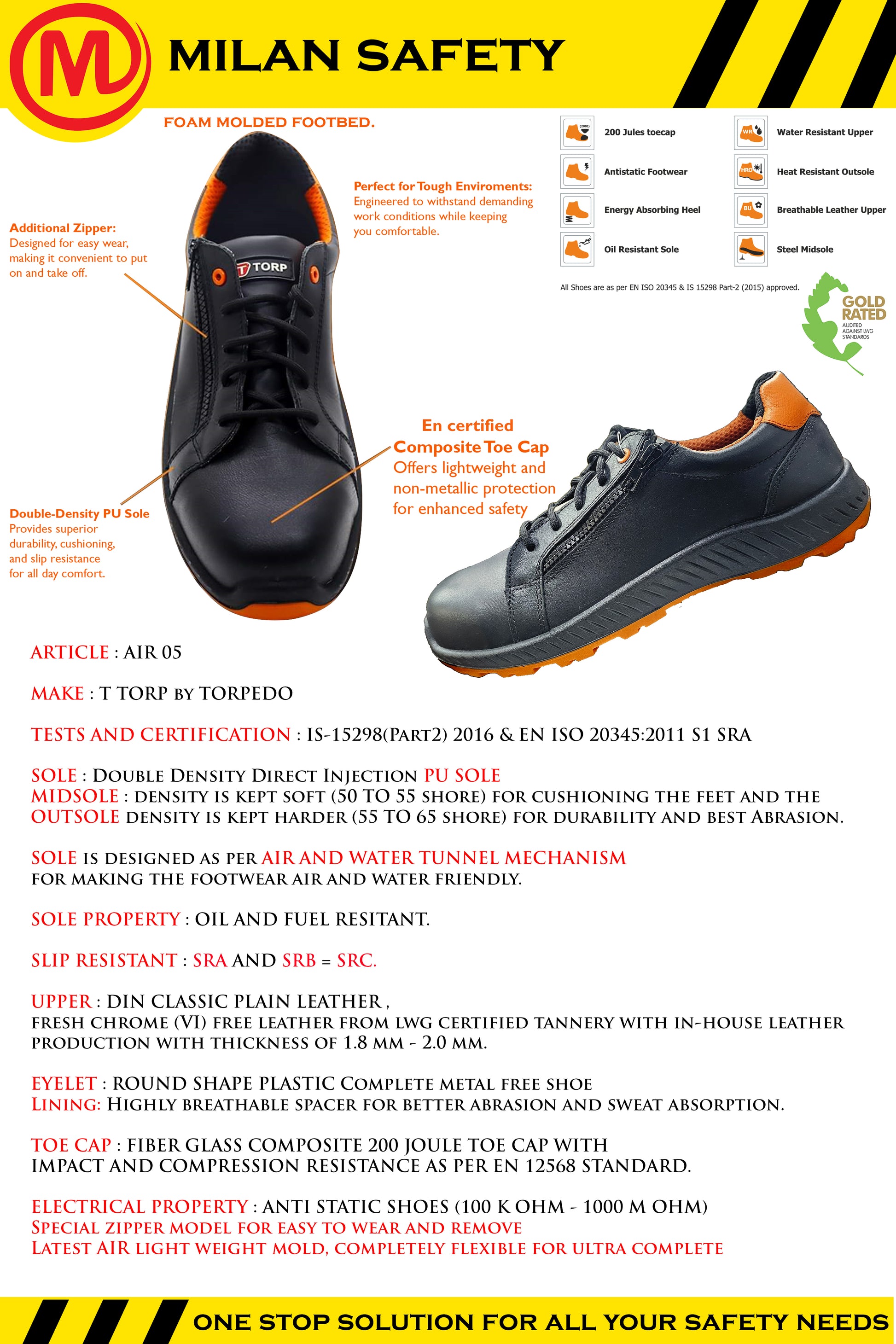 AIR 05 Safety Shoes – Composite Toe, Zipper Model, Dual Density PU Sole, Oil & Water Resistant, Lightweight & Antistatic
