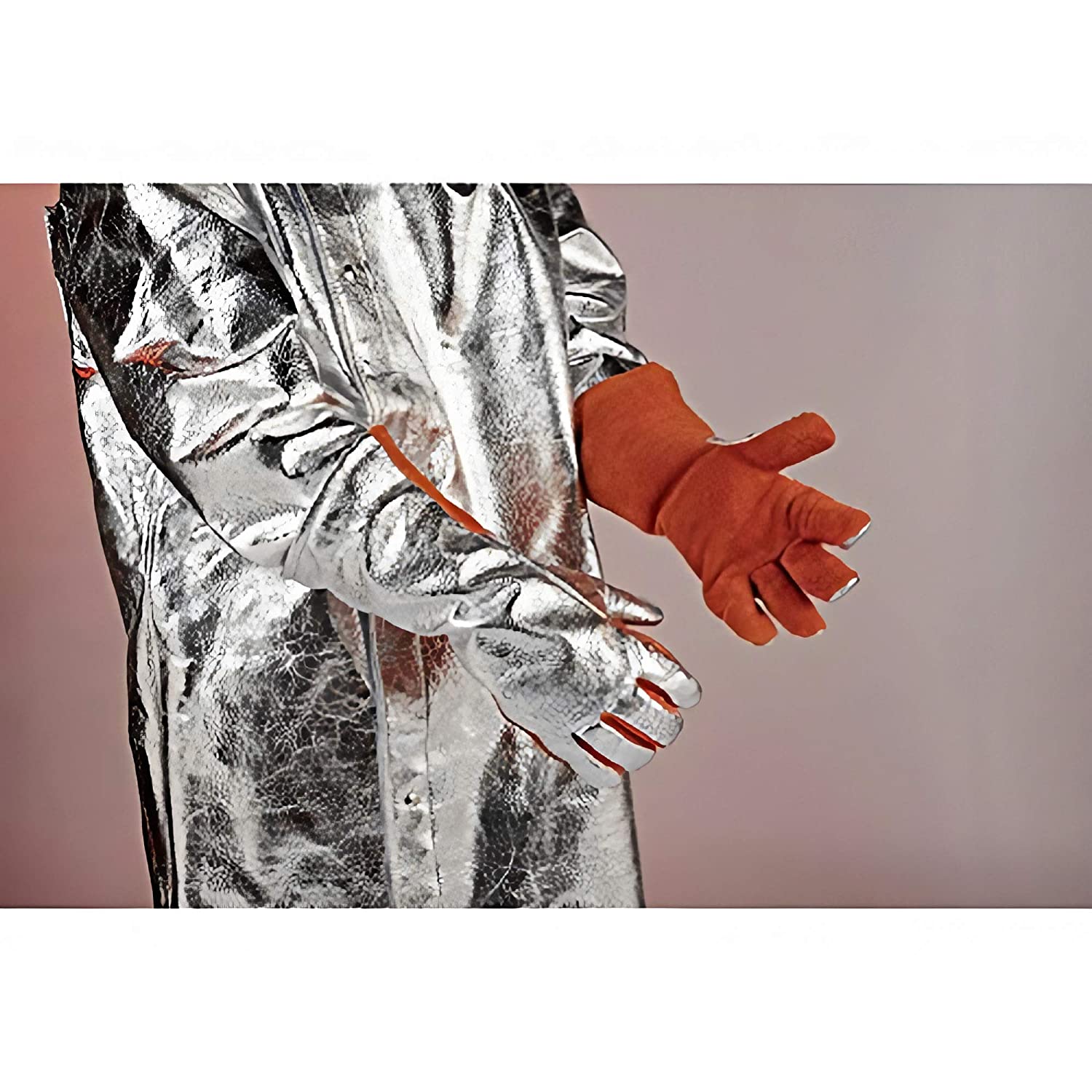 These gloves are made of a combination of Kevlar fiber and aluminum foil. Kevlar is a synthetic fiber that is five times stronger than steel and provides excellent cut and abrasion resistance. The aluminum foil layer reflects heat and protects the wearer's hands from radiant heat.