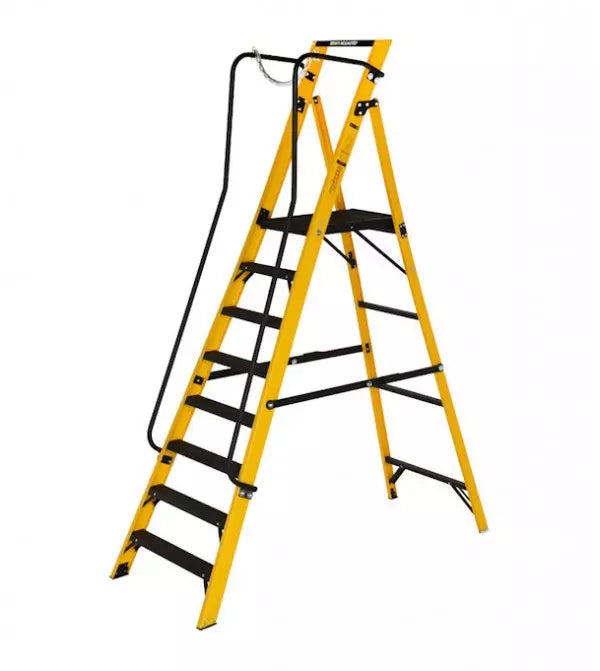 The Youngman Industrial FRP Megastep is constructed using durable, non-conductive fiberglass (FRP) rails that are highly resistant to weathering and ideal for electrical environments. Featuring twin handrails, a safety chain, and a large working platform, this ladder provides 360° protection and superior comfort for professional users.