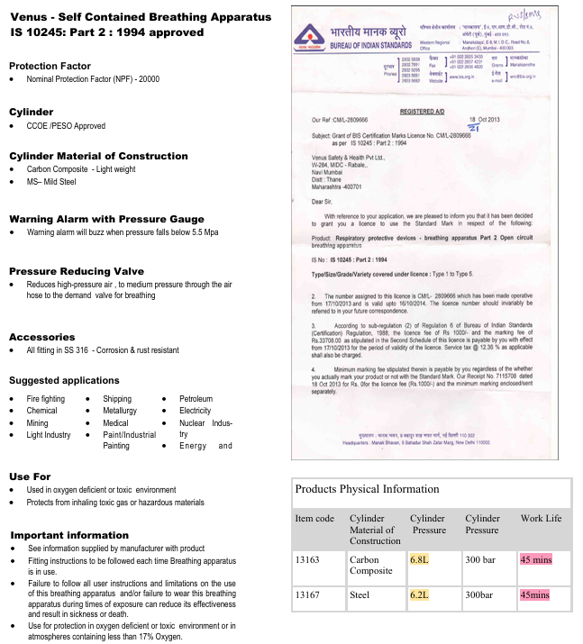 Size: Venus SCBA 108-6AS backplate V666+6LTR cylinder, HSN 90200000 STEEL SCBA (Carrying Case Not Included )10 in stock