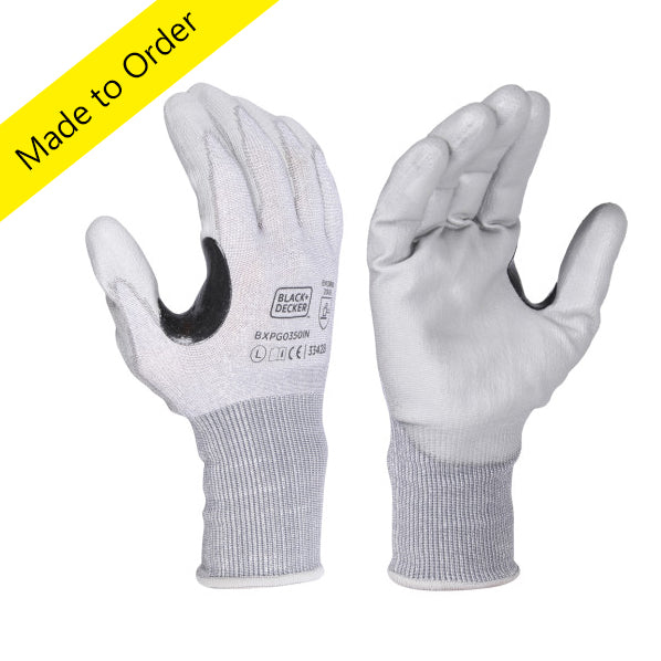 Black + Decker supported hand gloves having 18 gauge HPPE liner, TDM-b, grey PU coating smooth finish and reinforced purlicue area which makes it ideal for use in handling of glass, metal sheets and sharp objects, steel and automotive industry.